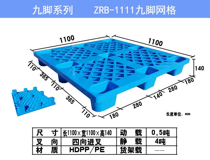 1111九腳網格塑料托盤屬于輕型塑料托盤的范疇,我廠生產的九腳網格塑料托盤動載可達1.3噸(貨物需纏繞膜或打包帶固定),靜載可以到4噸,1.5米高度跌落不開裂,是輕型貨物比較理想的塑料托盤